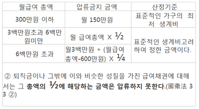 ① 급료, 연금, 임금, 봉급, 상여금, 세비, 퇴직연금 그밖에 이와 비슷안 성질을 가진 급여채권에 대하여 다음 표와 같이 해당하는 금액은 압류하지 못한다.(國徵法 33 ①)